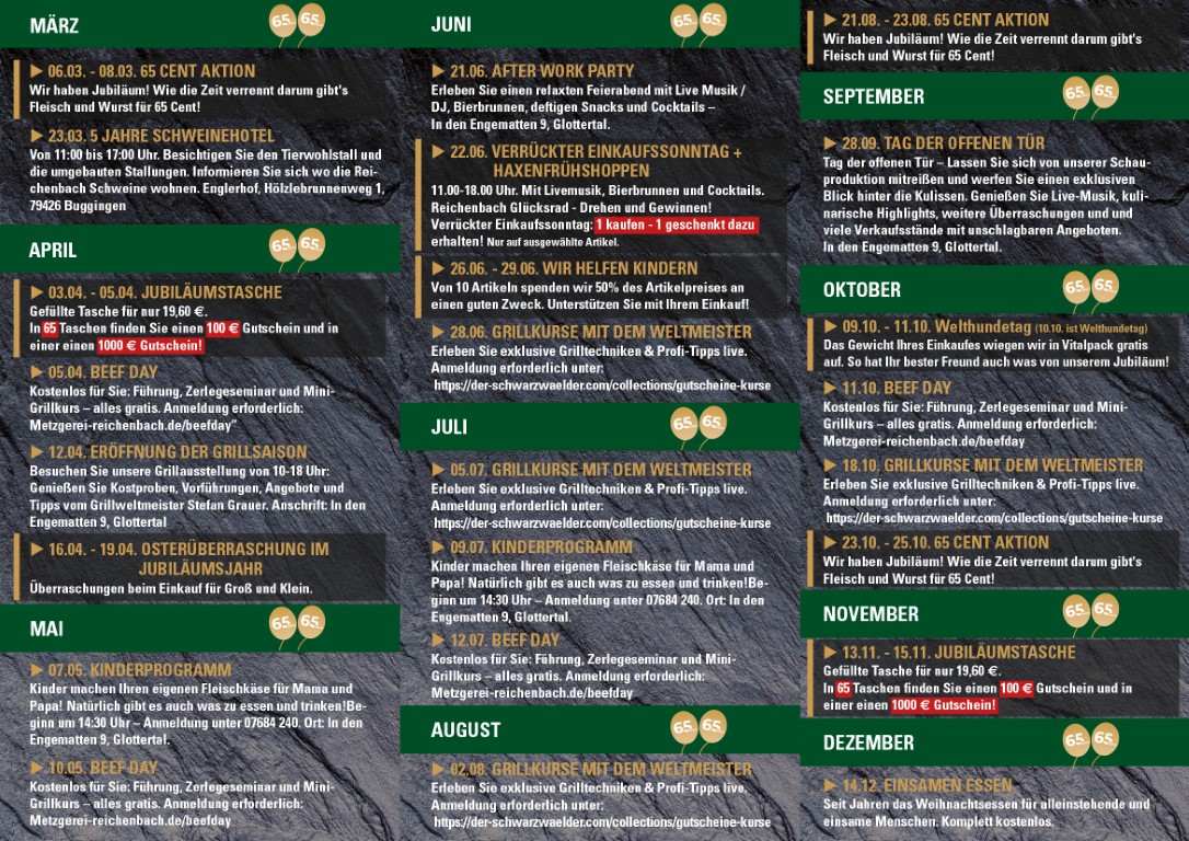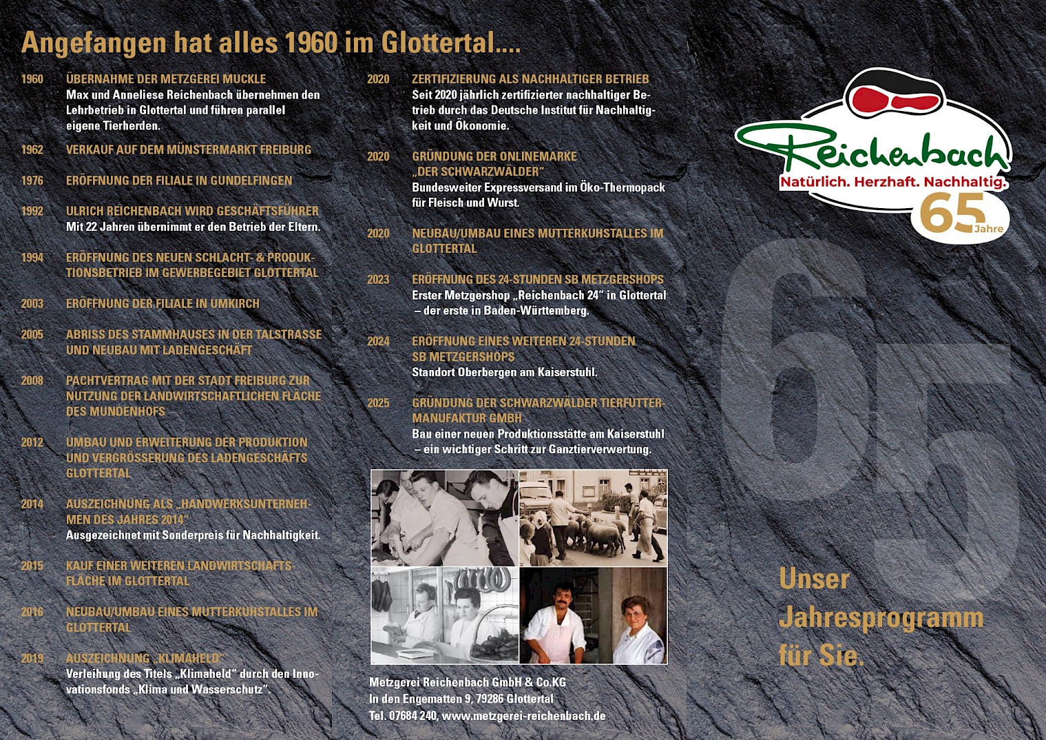 Seit 1960 steht unsere Metzgerei für Handwerk, Regionalität und Qualität. In diesem Jahr feiern wir 65 Jahre Reichenbach – mit vielen besonderen Veranstaltungen, Angeboten und Überraschungen für unsere Kunden.