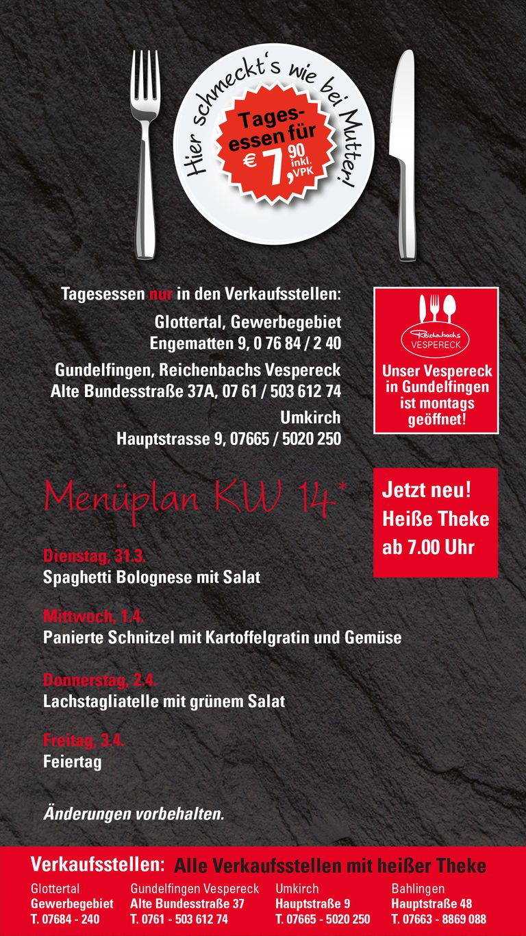 Tagesessen – täglich frisch in unseren Filialen, gekocht wie früher bei Mutter.