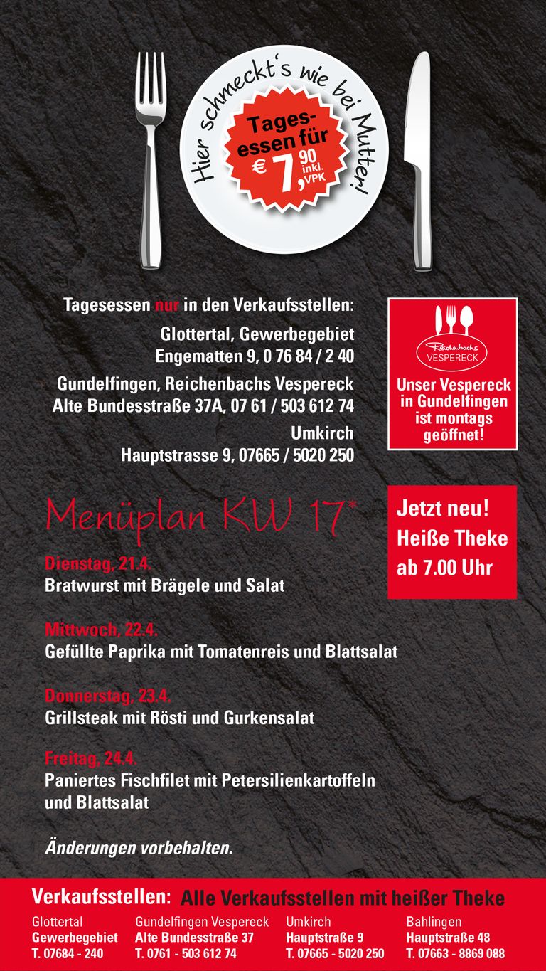 Tagesessen – täglich frisch in unseren Filialen, gekocht wie früher bei Mutter.