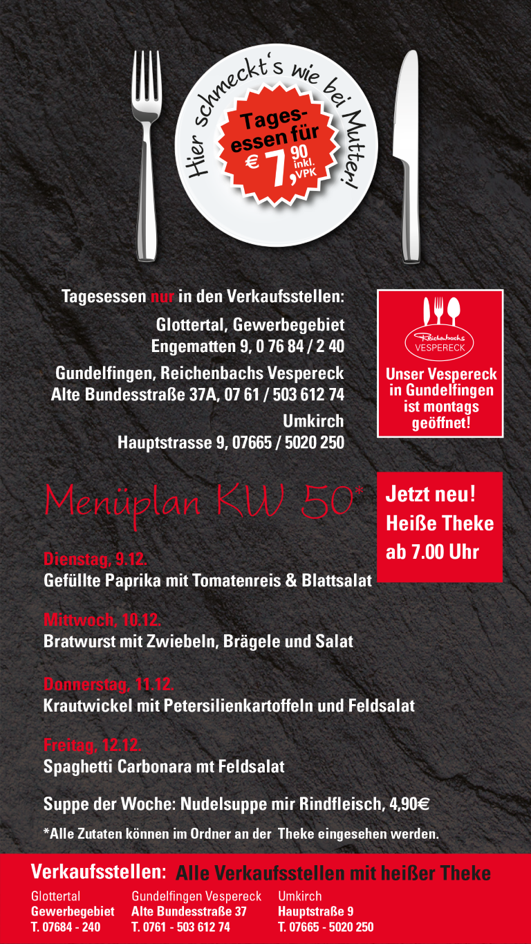 Tagesessen – täglich frisch in unseren Filialen, gekocht wie früher bei Mutter.